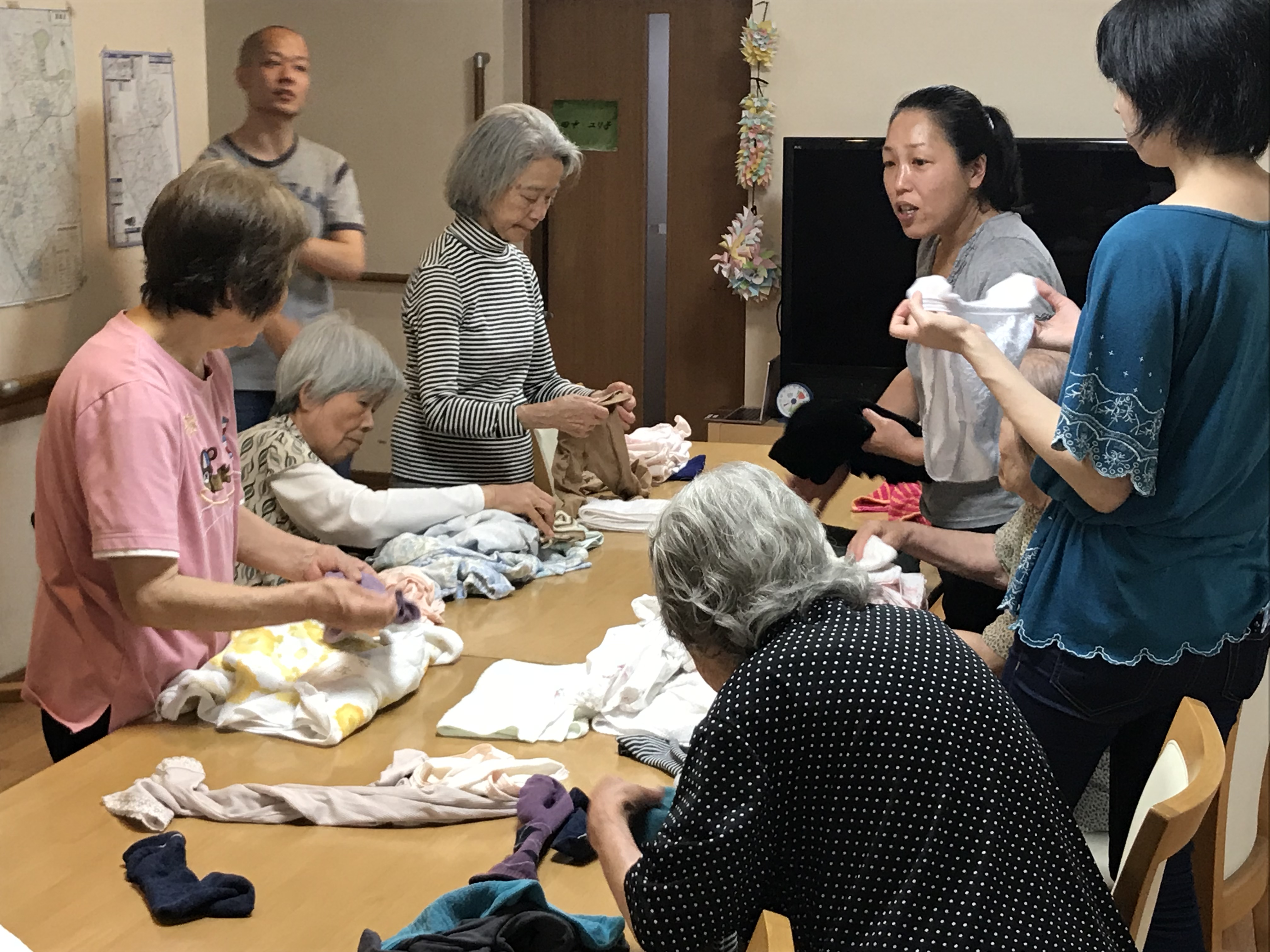 自由な時間・・いろいろ テレビを見たり、ドライブへ出かけたり、地域の集まりに出かけたり、お風呂も順次好きな時間に入れます。洗濯物が乾いたら、みんなでたたんで片づけます。 |