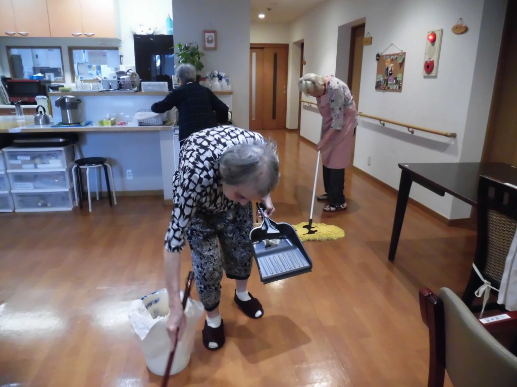 入居者さんと一緒に掃除・洗濯 天気が良ければ屋上まで洗濯物を干しに行きます。掃除も、ほうきや掃除機が使える方はご自分でしていただいています。ほかに散歩に行く方、リビングや居室でテレビを見る方様々です。 |