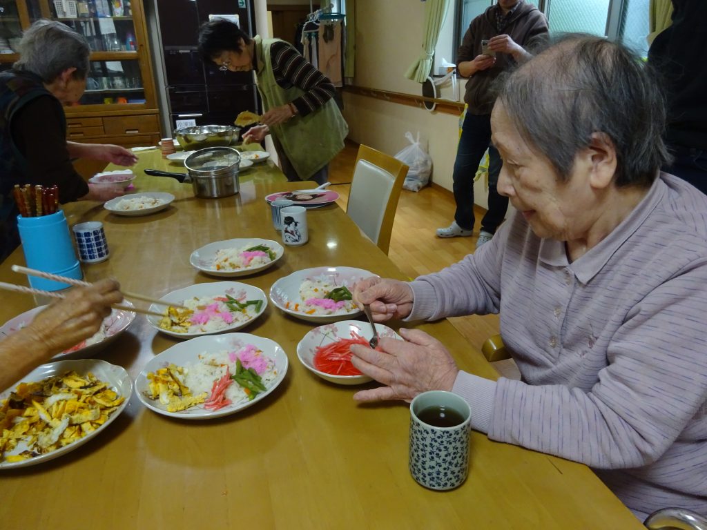 入居者さんと一緒に昼食準備 or 外食 一日のメニューも入居者さん達で決めています。あれが良い、これが良い、なんでも良い(笑)とワイワイガヤガヤとメニューが決まったら入居者さん数人で、近所のスーパーまで買い出しに出かけたり、時には公園でお弁当、ファミレスで外食することもあります。 |